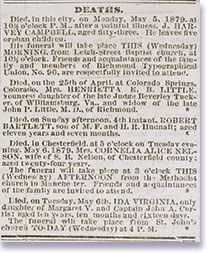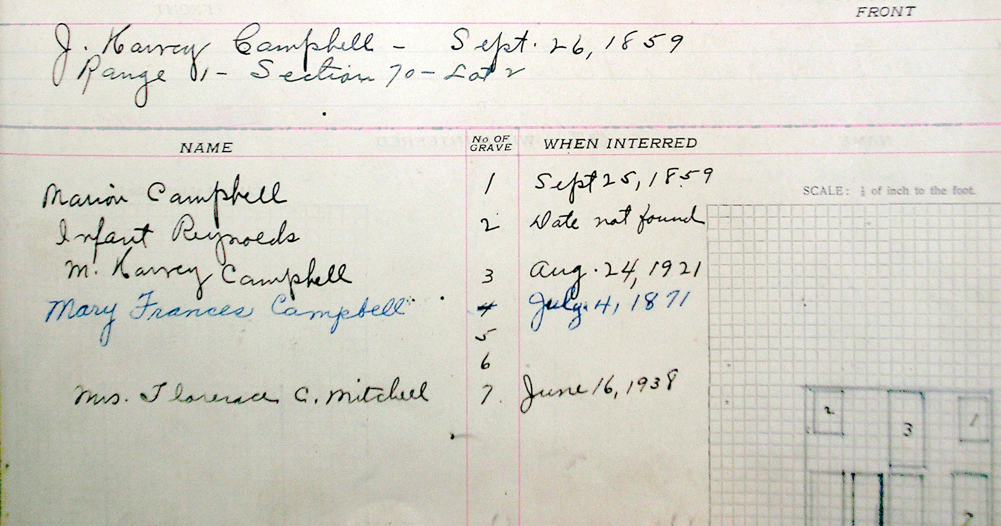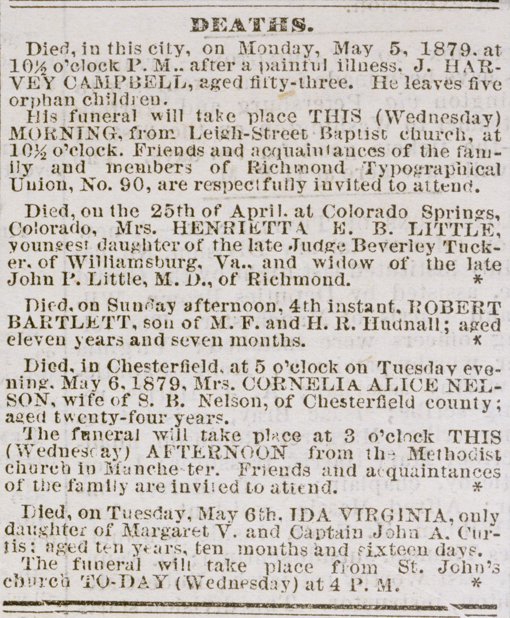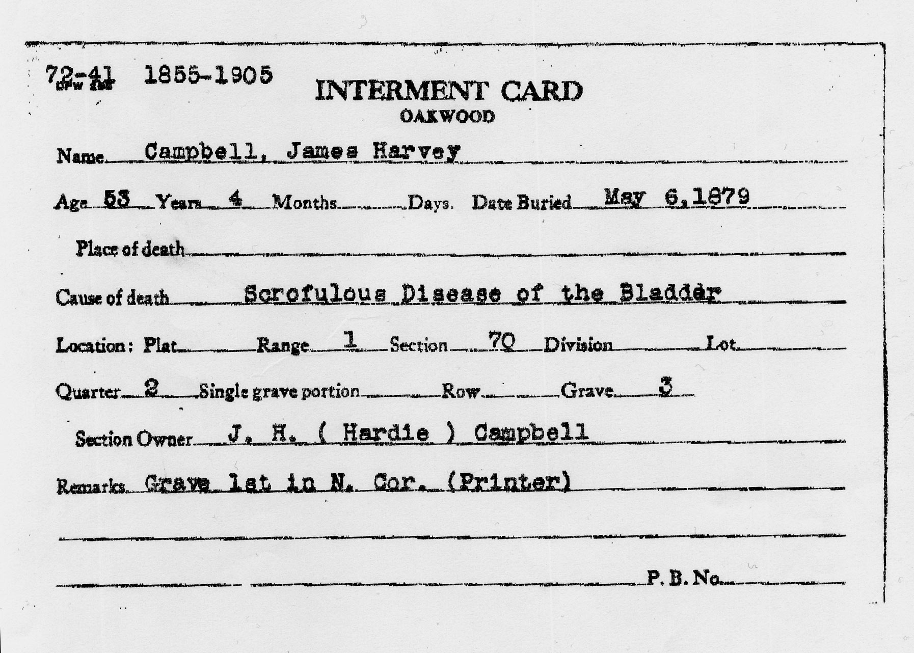 Mary Frances Campbell died ca. July 1871, and James Harvey Campbell died on Monday May 5, 1879 of scrofulous disease of the bladder. His funeral was held on Wednesday May 7, 1879 at Leigh Street Baptist Church. He and his family are buried in a family plot in Oakwood Cemetery in Richmond, Virginia.