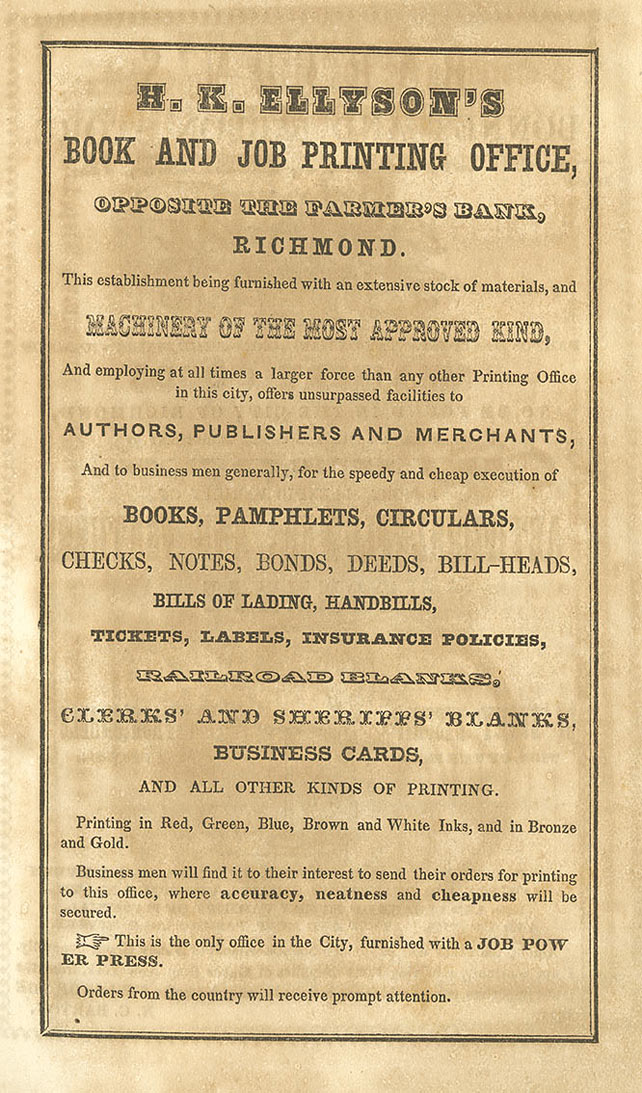 From 1850–1859 James Harvey Campbell worked as a printer in Henry Keeling Ellyson’s Book and Job Printing Office, located at 176 Main Street in Richmond, Virginia. In this letter Mary Frances Campbell is away from home, most likely visiting relatives.
